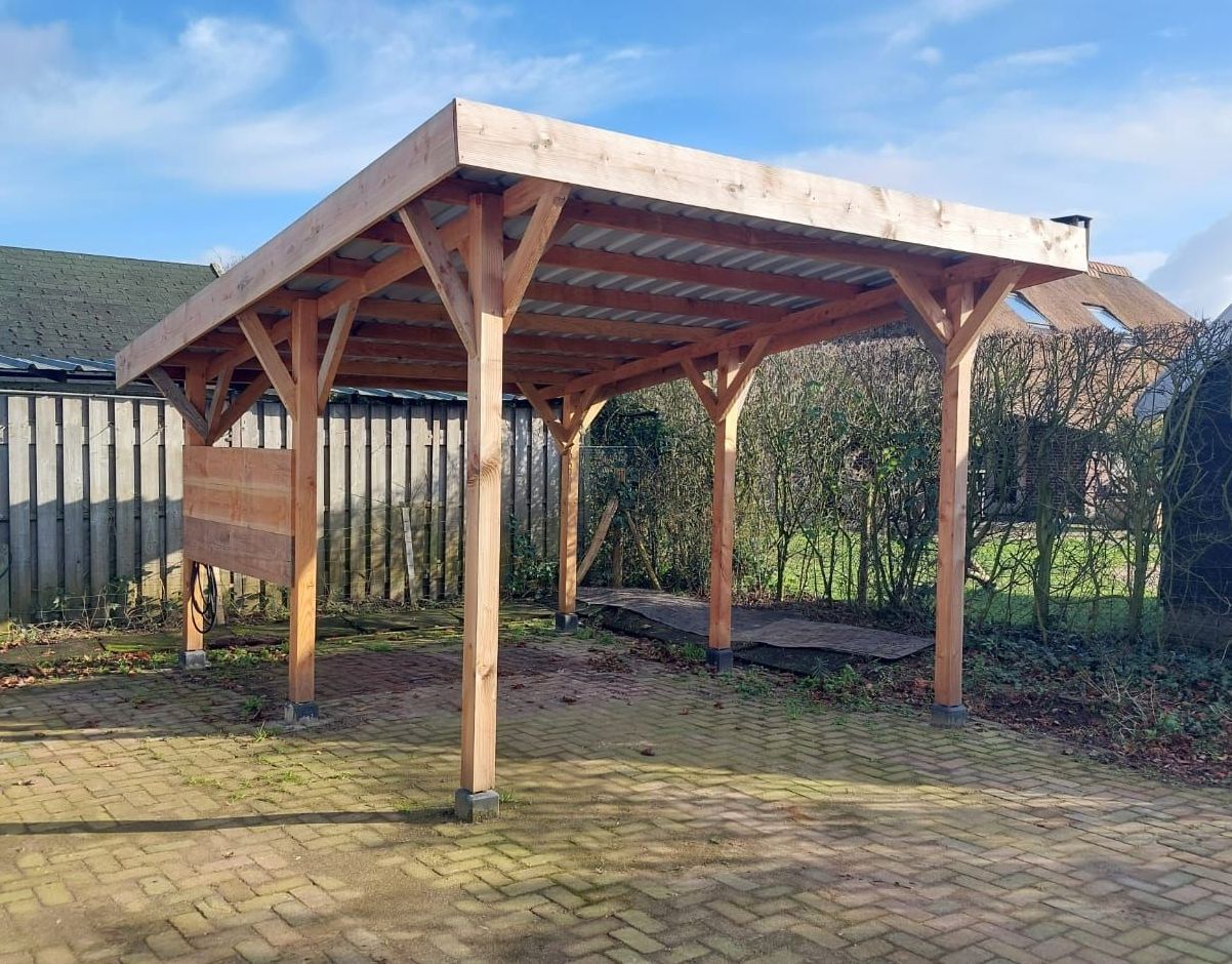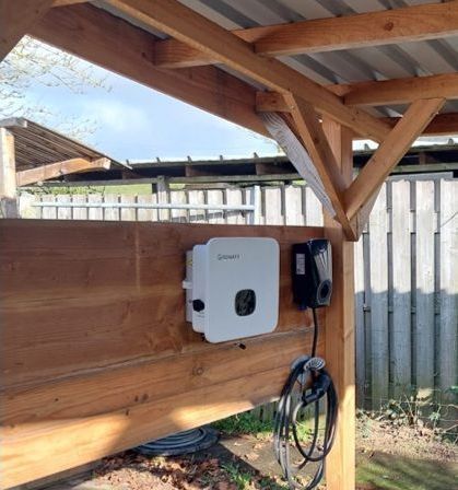 Daar wij met lichtgewicht zonnepanelen werken op een metaal trapezium dak, kunnen wij volstaan met een licht uitgevoerde constructie. Deze constructie is volledig van FSC gecertificeerd Douglas hout. Door naast de omvormer een oplaadunit te bevestigen krijgt u zo relatief goedkoop uw eigen oplaad station. Uw auto staat beschermd, droog en sneeuwvrij en kan zowel met 3 fase als 1 fase laadunit opgeladen worden. En als u overdag geen tijd heeft om te laden kan de zelf opgewekte stroom uiteraard ook opgeslagen worden in uw eigen batterij unit.